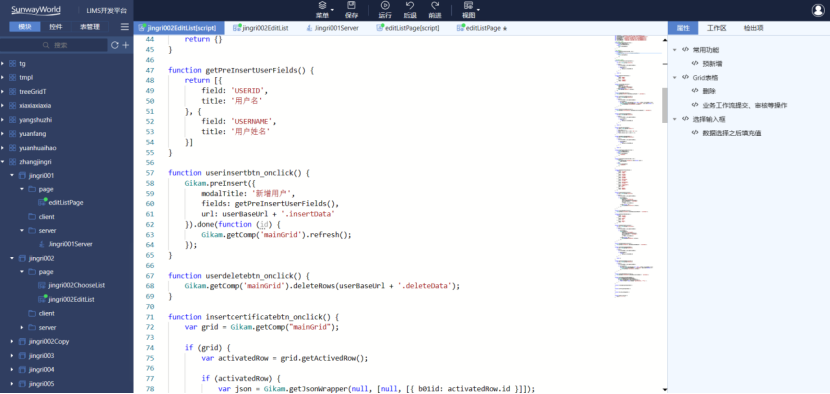 基于BS架構,平臺支持業務腳本(Js和Java)的在線編輯,同時,準確的錯誤提示、腳本自動補全、代碼塊的可視化封裝、實時的界面預覽及操作日志輸出,很大程度上幫助開發者提升開發效率,降低代碼的理解程度,使得編輯出復雜度更高的應用成為了可能。