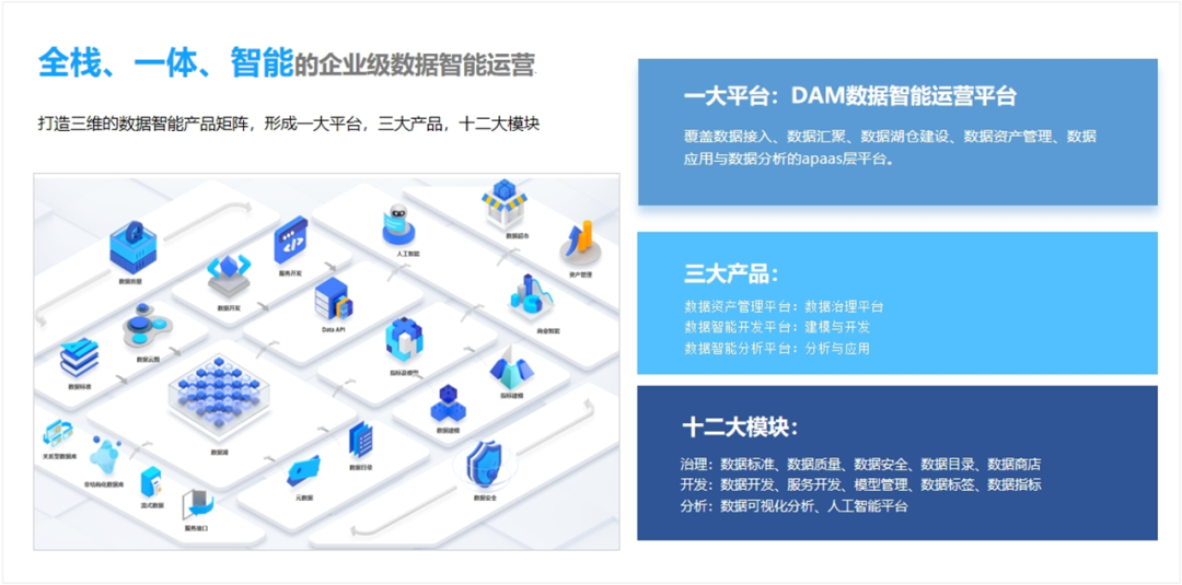 DAM數據資產管理平臺是全棧、一體、智能的企業級數據智能運營平臺,形成了一大平臺三大產品十二大模塊的完整產品矩陣。主要包括治理、開發、分析三大產品,涵蓋數據目錄、數據標準、數據質量、數據安全、數據開發、主數據建模、數據建模、指標建模、標簽建模、AI人工智能、BI商業智能、數據超市能等12大模塊,支持從數據治理到數據開發到數據分析的全鏈路的數據資產管理能力。