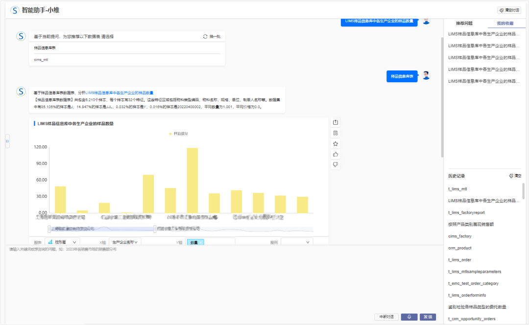 結合新一代技術,基于大模型實現智能數據分析,通過提供問答式的交互來降低操作門檻,基于NL2SQL實現數據的可信、可追溯。同時基于三維天地在檢驗檢測數智化領域的多年深耕與思考,訓練了基于LIMS垂直行業的大模型,涵蓋食品檢測、動植物檢測、實驗室檢測、綜合第三方檢測、環境檢測以及醫學監測等各行各業,綜合萬億級的實際項目數據和千余條行業指標,打造出一款基于LIMS領域的ChatBI應用。