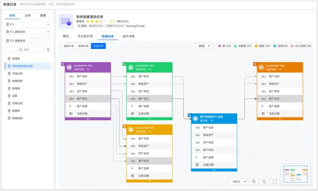 傳統的數據資產目錄主要集中在結構化數據庫表管理。而三維天地的數據目錄在此基礎上擴展了BI看板、ETL作業、主數據模型等類型,可以展示更多樣的數據對象,更細節的血緣關系,更及時的數據特征。