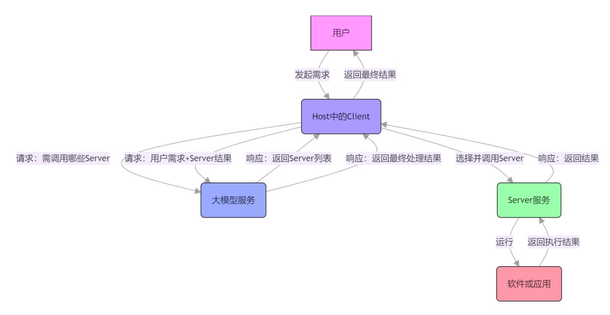 SunwayLink平臺中的MCP核心組件包含Host、Client、Server,Host內置了 Client的應用程序,可以是APP、Agent、Web應用、桌面應用等形態,Client是大模型與Server之間的橋梁,Server負責處理來自Client的請求、調用各種資源、返回相應的結果或數據,MCP工作流程如下: